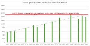 De bouwvergunning voor het nieuwe treinstation in 2006 voorzag 6.800 fietsenstallingen, maar de realiteit dwong de partners om dat aantal steeds te verhogen. Het bijplaatsen van fietsenstallingen kon stijgend fietsgebruik echter nooit inhalen, waardoor het tekort al 20 jaar aanhoudt. Bij het afwerken van het treinstation tegen 2029 voorziet men nu 18.500 fietsplaatsen. Dat zal te weinig zijn, gelet op de verwachte stijging van studenten (jaarlijks stijgt het aantal studenten met ongeveer 2.000), pendelaars en Gentenaars de komende jaren, én een stijging in het gebruik van de fiets als voor- en natransportmiddel van het openbaar vervoer (jaarlijks stijgt het aantal fietsen in Gent met 7%).