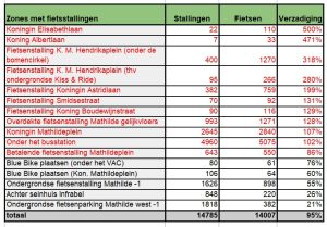 17 januari 2026 at 4:51pmRond station Gent-Sint-Pieters blijken er 14.007 fietsen te staan, zo bleek uit een telling van vrijwilligers van Gents MilieuFront en Fietsersbond Gent op zaterdag 17 januari 2026. Er zijn tegelijk maar 14.785 fietsparkeerplaatsen. De overbezetting bleek het grootst op het Koningin Maria Hendrikaplein. Tegelijk bleek uit een telling op vrijdag dat er nog plaats is in de nabijgelegen ondergrondse NMBS-autoparking. Beide verenigingen vragen dan ook om daar bijkomende fietsparkeergelegenheid te voorzien.