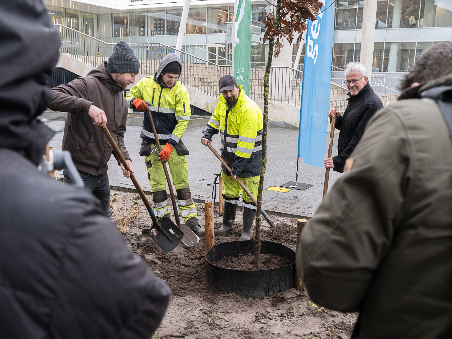 Donderdag 8 februari werden op het Woodrow Wilsonplein 3 toekomstbomen aangeplant. Een zomereik, een wintereik en een haagbeuk: het trio krijgt in hartje Gent alle kansen en ruimte om uit te groeien tot volwassen toekomstbomen. Dat zullen ze doen op een recent onthard terrein tussen de oude bibliotheek en het nieuwe Stadskantoor.