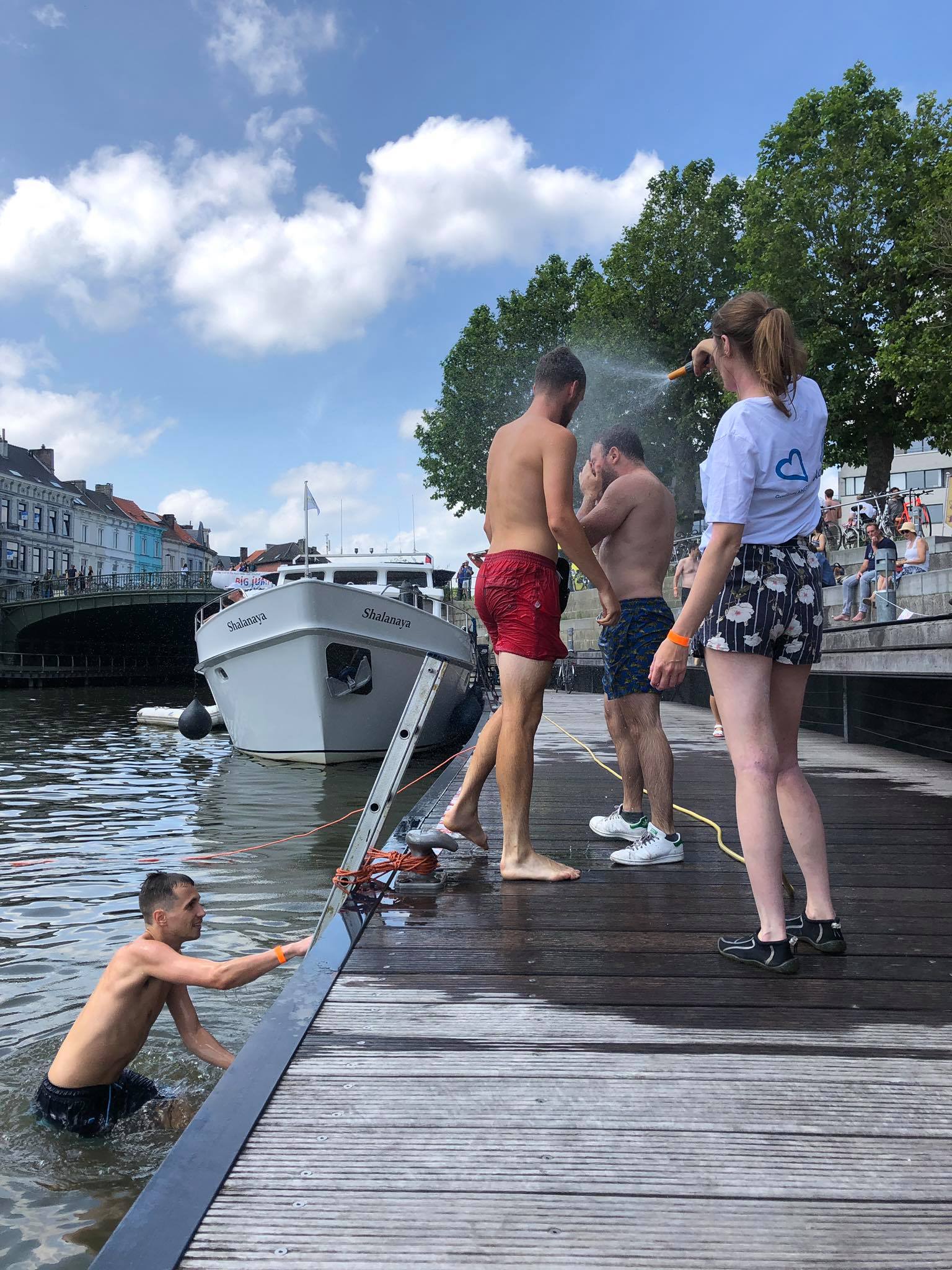 11 juli 2021 at 8:53amOp zondag 11 juli sprongen een 100-tal enthousiaste Gentenaars om klokslag 15u in de Leie aan Portus Ganda. De organisatie van deze editie van de Big Jump was een huzarenstukje: voor Gents MilieuFront (GMF) en de organiserende partners was het tot vrij laat koffiedik kijken of deze editie zou kunnen doorgaan of niet. De watertest was goed genoeg om de jump te laten doorgaan en wegens hogere e-coli waarde enkel gezonde personen, en geen kinderen. Maar zoals het echte Gentenaars betaamt, werd het een klein knalfeestje op zich!