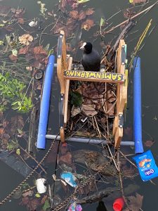 In het voorjaar ’25 heb ik – verspreid over heel Gent – zeven felgekleurde platformen in het water gelegd, waarop meerkoeten kunnen broeden. Die hebben immers de gewoonte om een drijvend nest te maken en gebruiken daarbij alles wat ze tegenkomen. In een groene omgeving vinden ze gemakkelijk natuurlijke materialen, maar in de stad zijn ze helaas aangewezen op afval. Bij het bouwen van hun nest vissen de meerkoeten zo het vuilnis uit het water.’