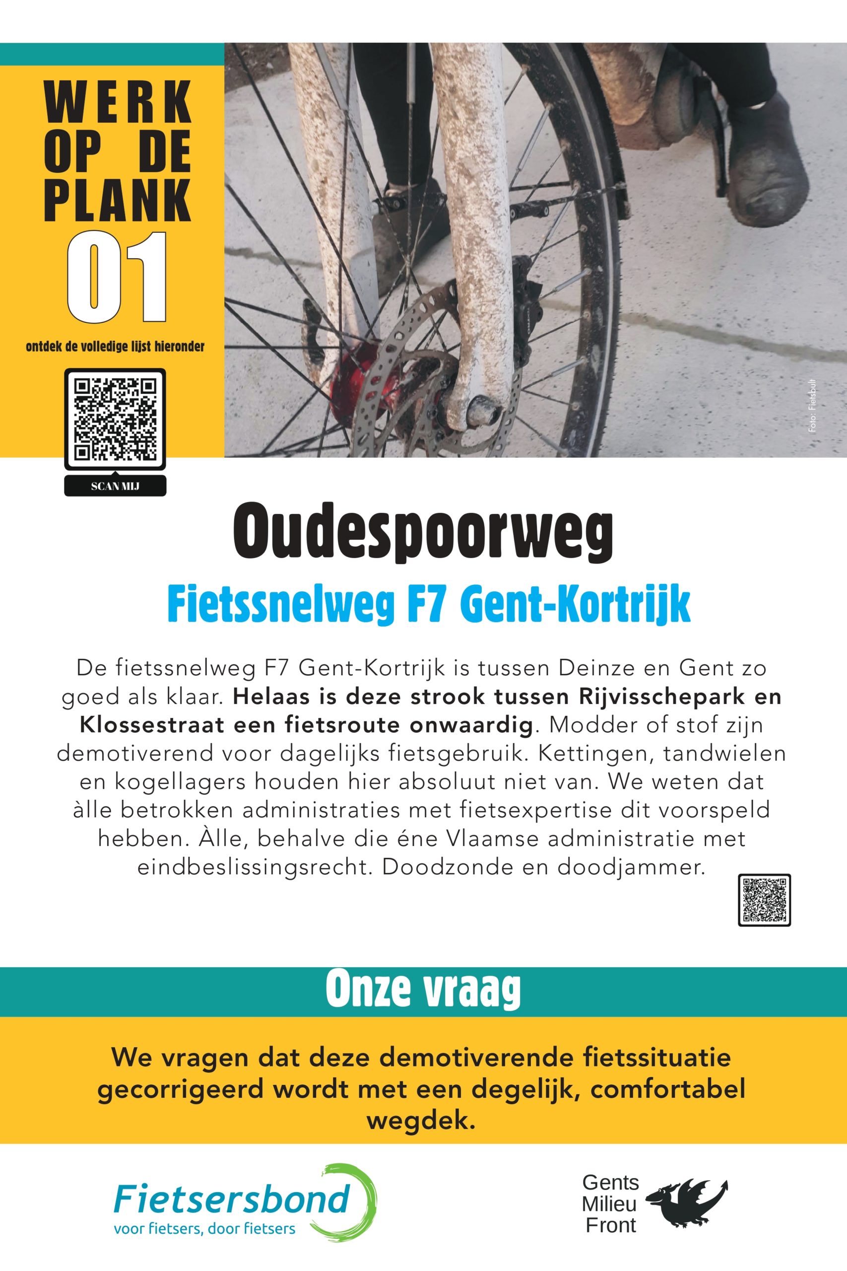 De fietssnelweg F7 Gent-Kortrijk is tussen Deinze en Gent zo goed als klaar. Helaas is deze strook tussen Rijvisschepark en Klossestraat een fietsroute onwaardig. Modder of stof zijn demotiverend voor dagelijks fietsgebruik. Kettingen, tandwielen en kogellagers houden hier absoluut niet van. We weten dat àlle betrokken administraties met fietsexpertise dit voorspeld hebben. Àlle, behalve die éne Vlaamse administratie met eindbeslissingsrecht. Doodzonde en doodjammer