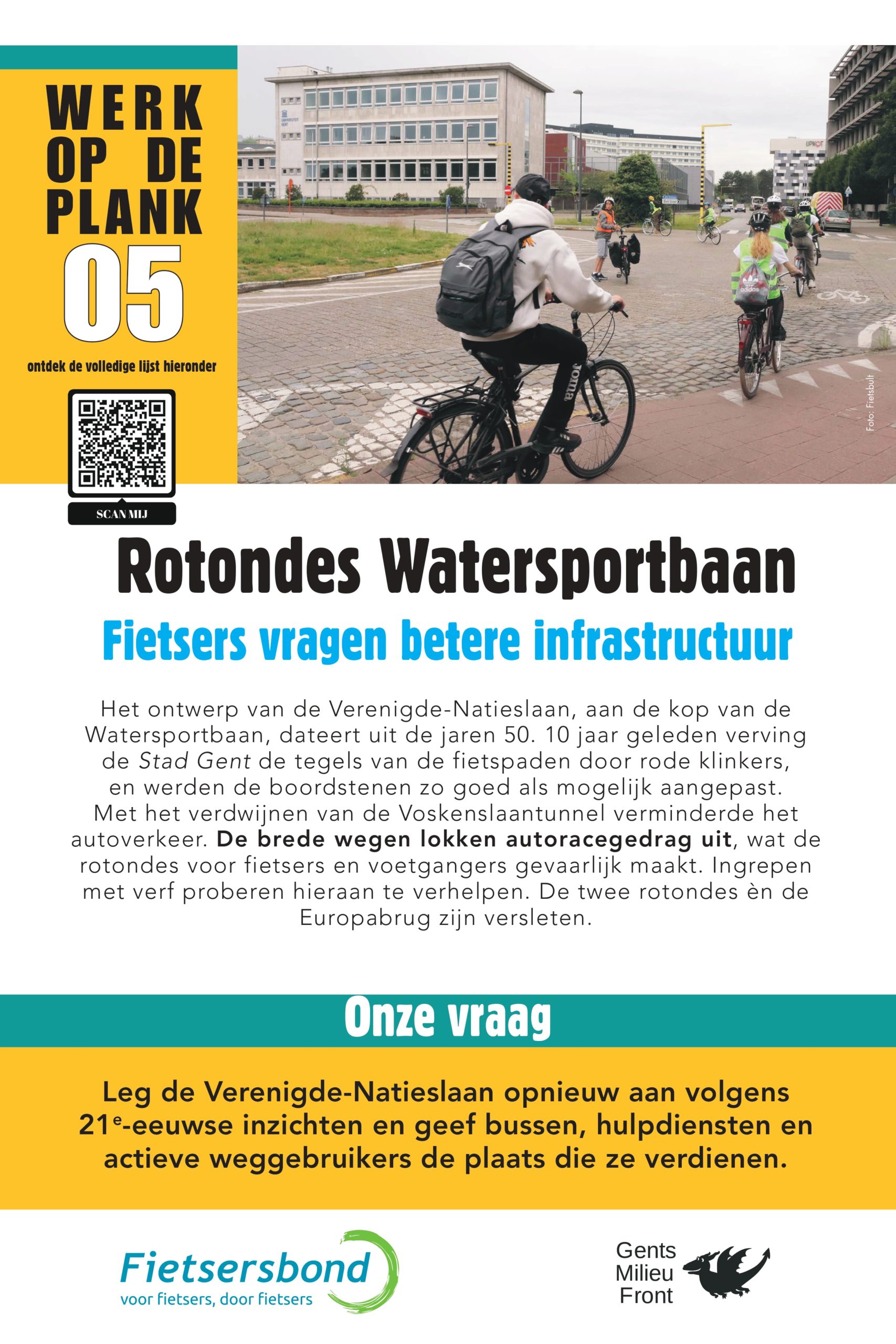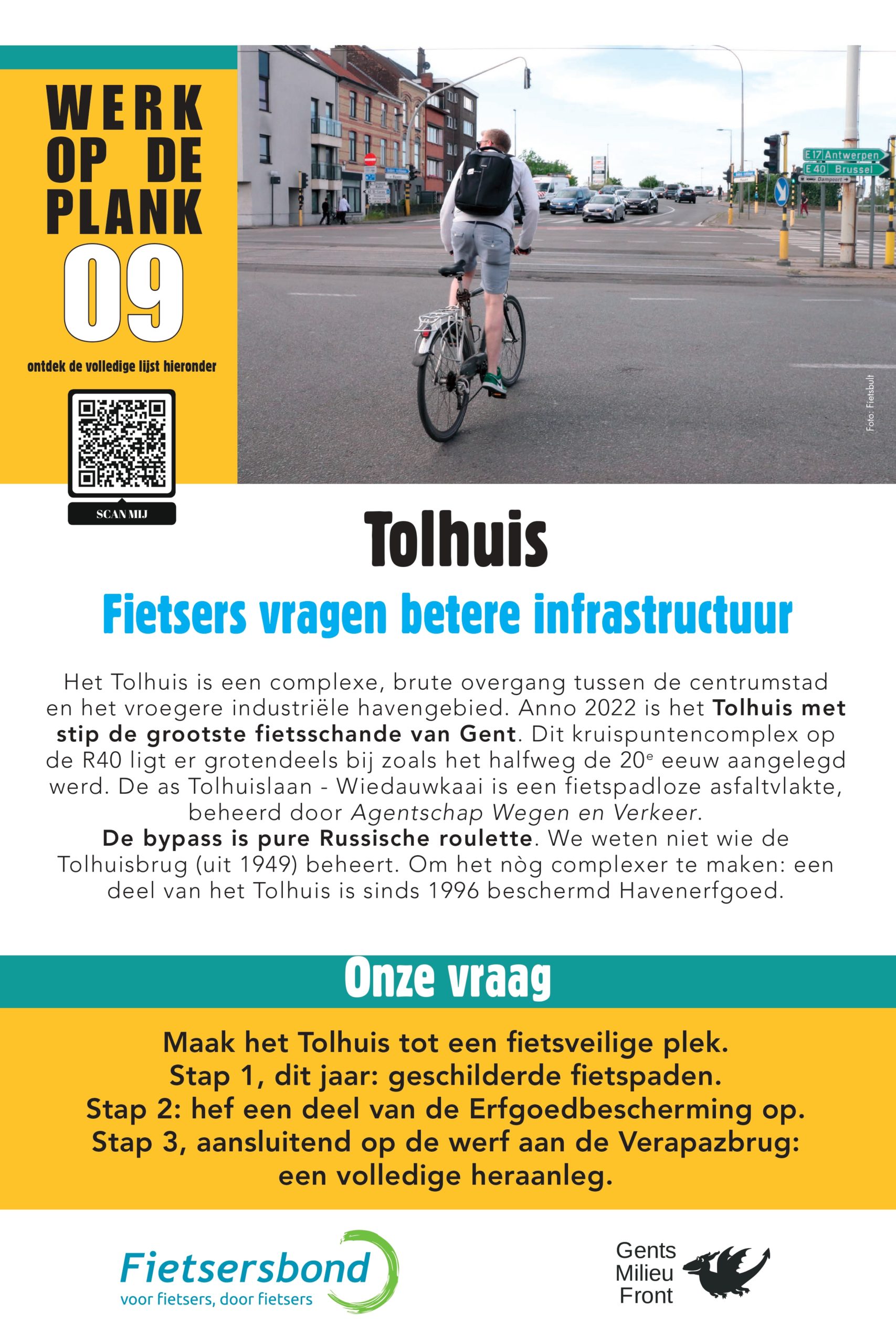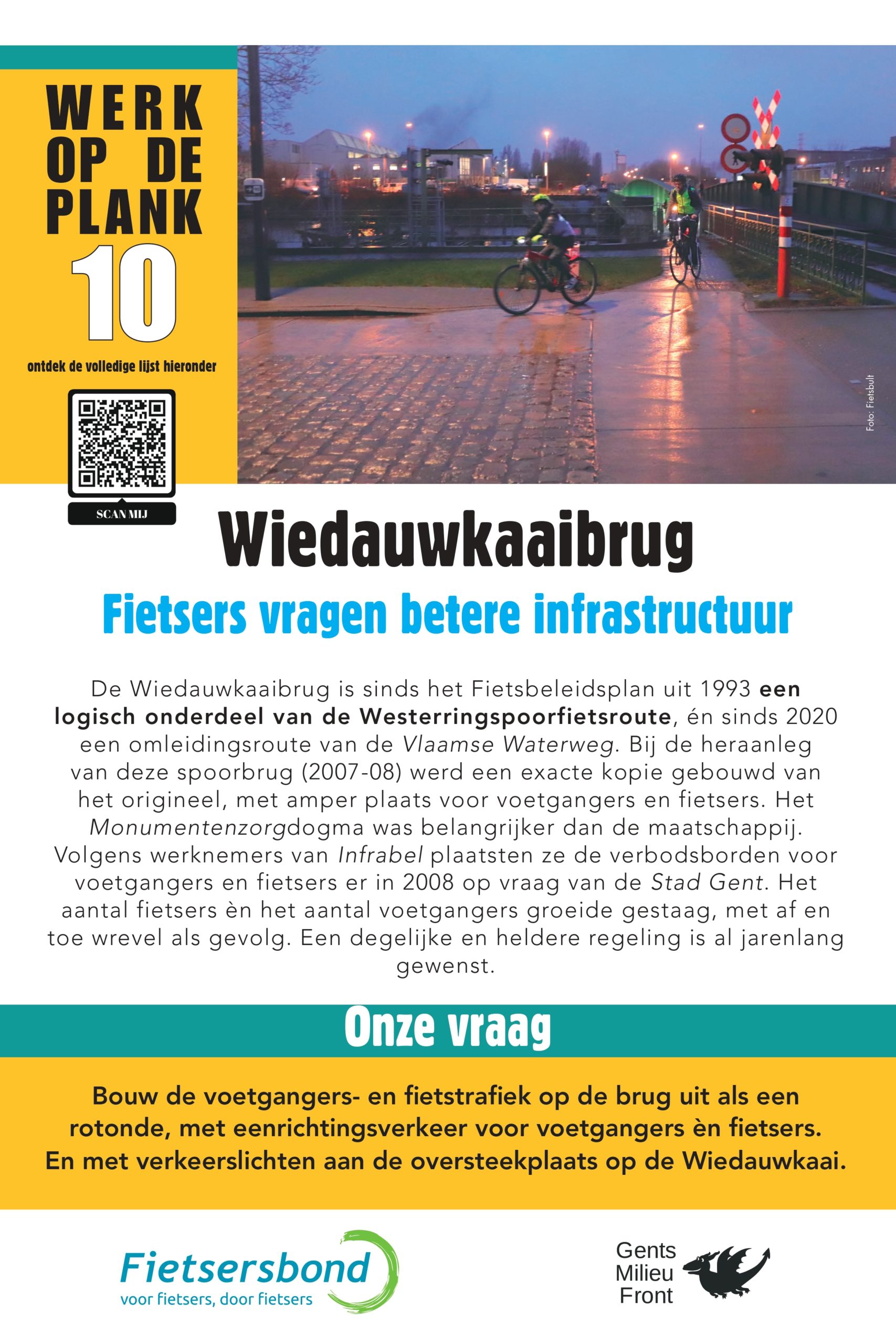 Sinds 2013 lijsten Gents MilieuFront en Fietsersbond Gent regelmatig 10 punten op in de Gentse fietsinfrastructuur die beter kunnen. Na 5 fietspad-schilderacties met telkens een vernieuwde shortlist van zwarte fietspunten is het nu tijd voor een infoborden-actie. Op 10 locaties hangen borden met daarop een korte duiding, en een heldere vraag aan de overheden.