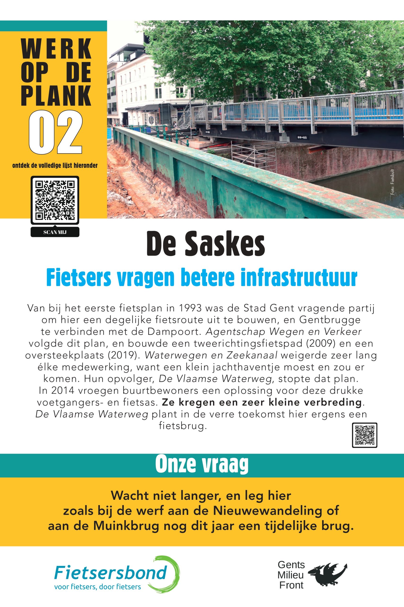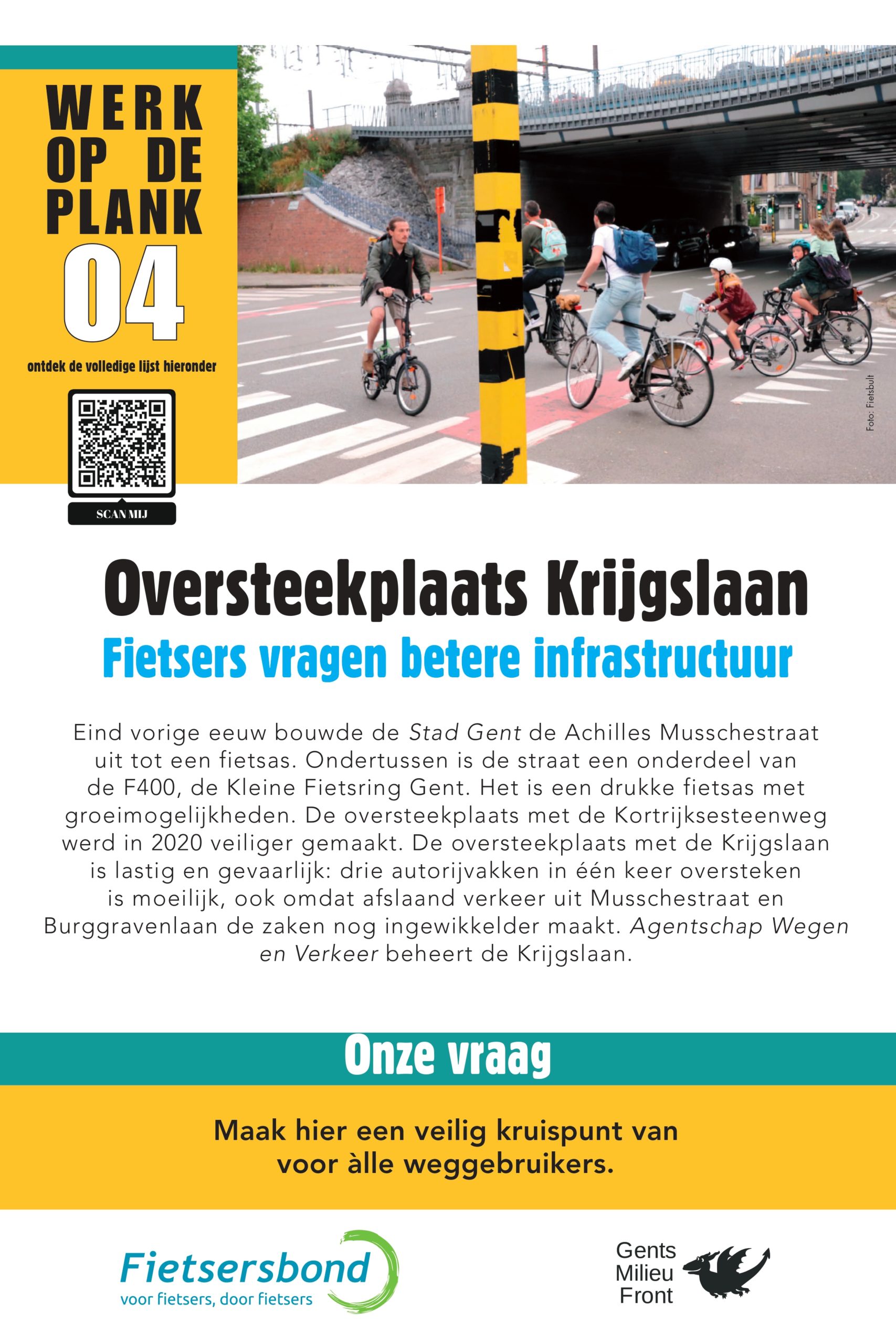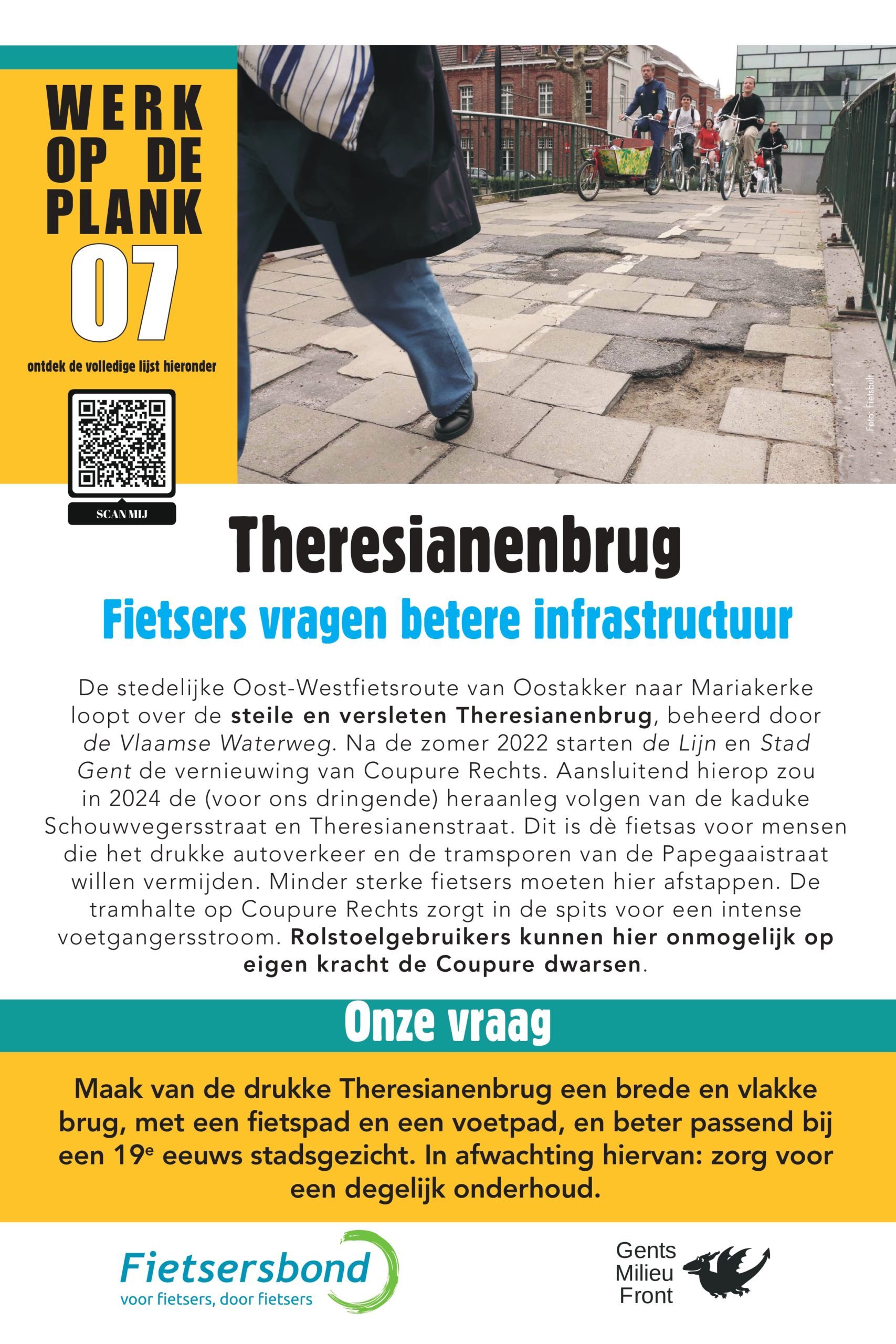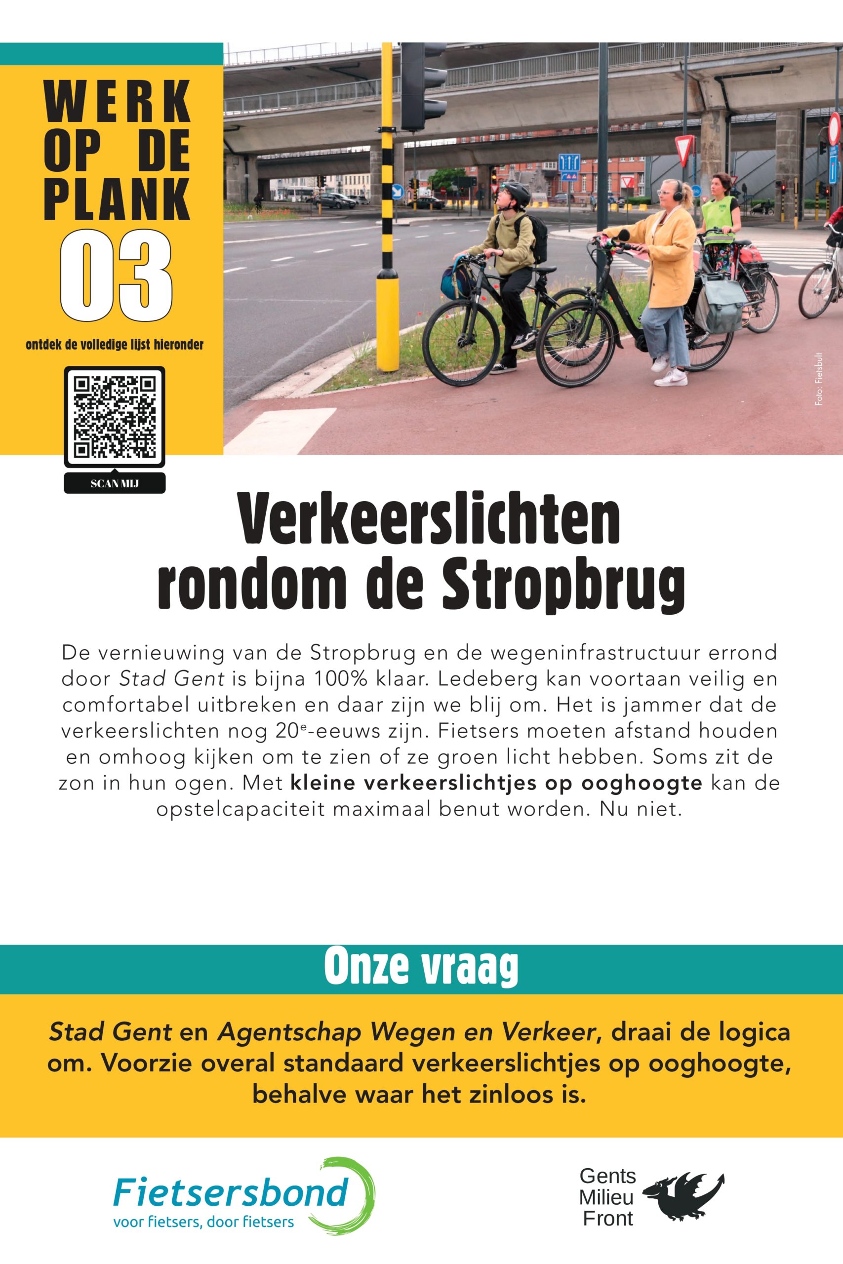 Sinds 2013 lijsten Gents MilieuFront en Fietsersbond Gent regelmatig 10 punten op in de Gentse fietsinfrastructuur die beter kunnen. Na 5 fietspad-schilderacties met telkens een vernieuwde shortlist van zwarte fietspunten is het nu tijd voor een infoborden-actie. Op 10 locaties hangen borden met daarop een korte duiding, en een heldere vraag aan de overheden.