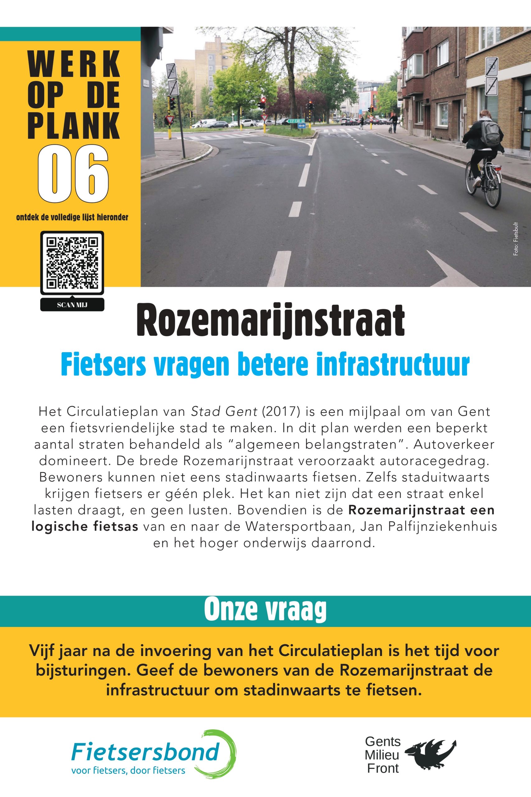 Het Circulatieplan van Stad Gent (2017) is een mijlpaal om van Gent een fietsvriendelijke stad te maken. In dit plan werden een beperkt aantal straten behandeld als “algemeen belangstraten”. Autoverkeer domineert. De brede Rozemarijnstraat veroorzaakt autoracegedrag. Bewoners kunnen niet eens stadinwaarts fietsen. Zelfs staduitwaarts krijgen fietsers er géén plek. Het kan niet zijn dat een straat enkel lasten draagt, en geen lusten. Bovendien is de Rozemarijnstraat een logische fietsas van en naar de Watersportbaan, Jan Palfijnziekenhuis en het hoger onderwijs daarrond.