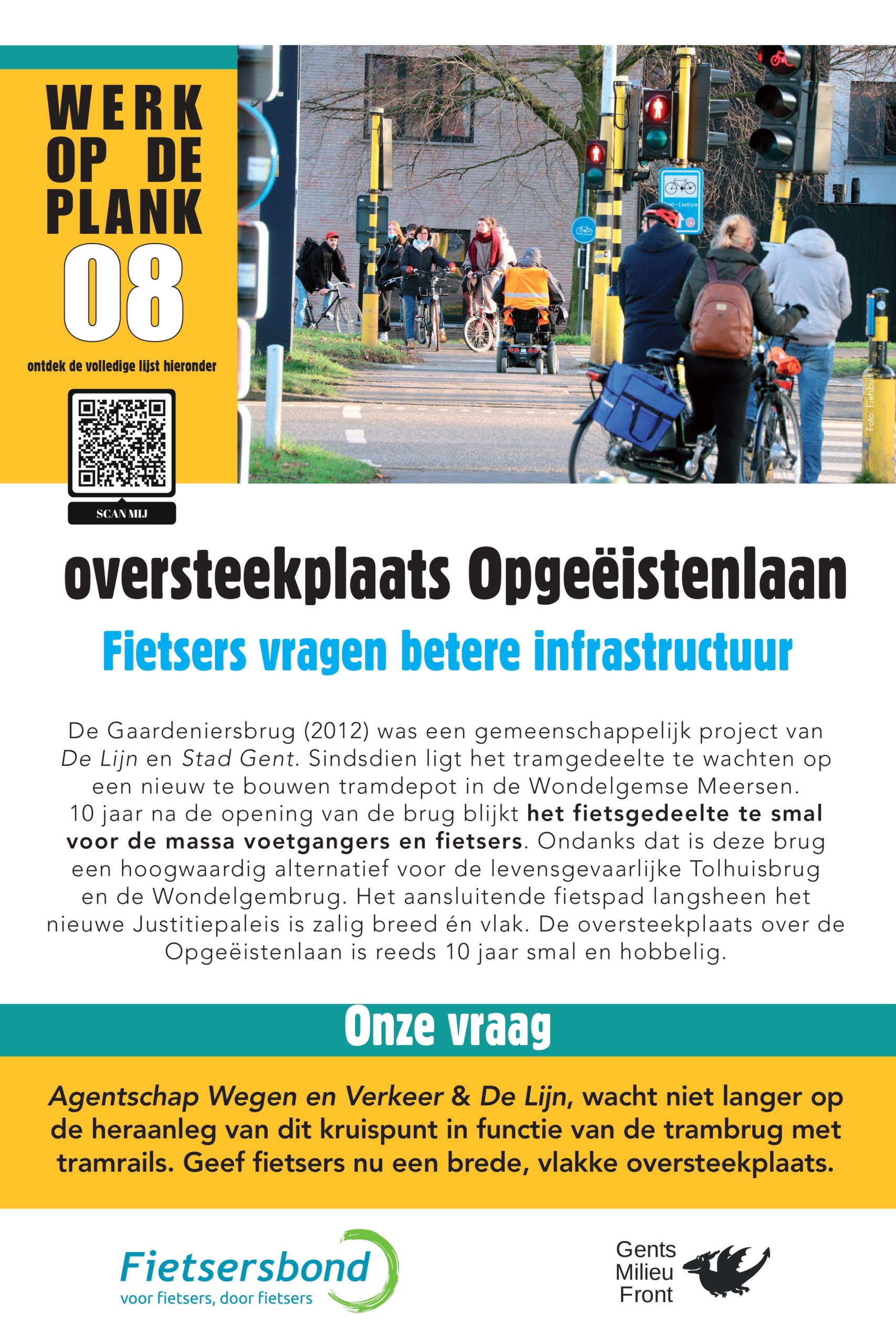 De Gaardeniersbrug (2012) was een gemeenschappelijk project van De Lijn en Stad Gent. Sindsdien ligt het tramgedeelte te wachten op een nieuw te bouwen tramdepot in de Wondelgemse Meersen. 10 jaar na de opening van de brug blijkt het fietsgedeelte te smal voor de massa voetgangers en fietsers. Ondanks dat is deze brug een hoogwaardig alternatief voor de levensgevaarlijke Tolhuisbrug en de Wondelgembrug. Het aansluitende fietspad langsheen het nieuwe Justitiepaleis is zalig breed én vlak. De oversteekplaats over de Opgeëistenlaan is reeds 10 jaar smal en hobbelig.
