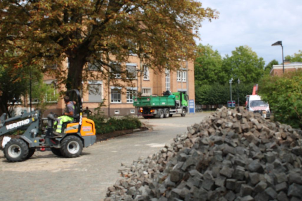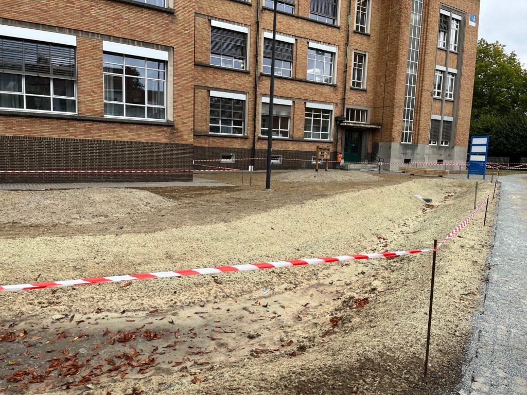 Ontharding en vergroening voorzijde campus Coupure en aanleg geveltuin aan de straatkant Ekkergem. De voorbereidende werken zijn gaande.