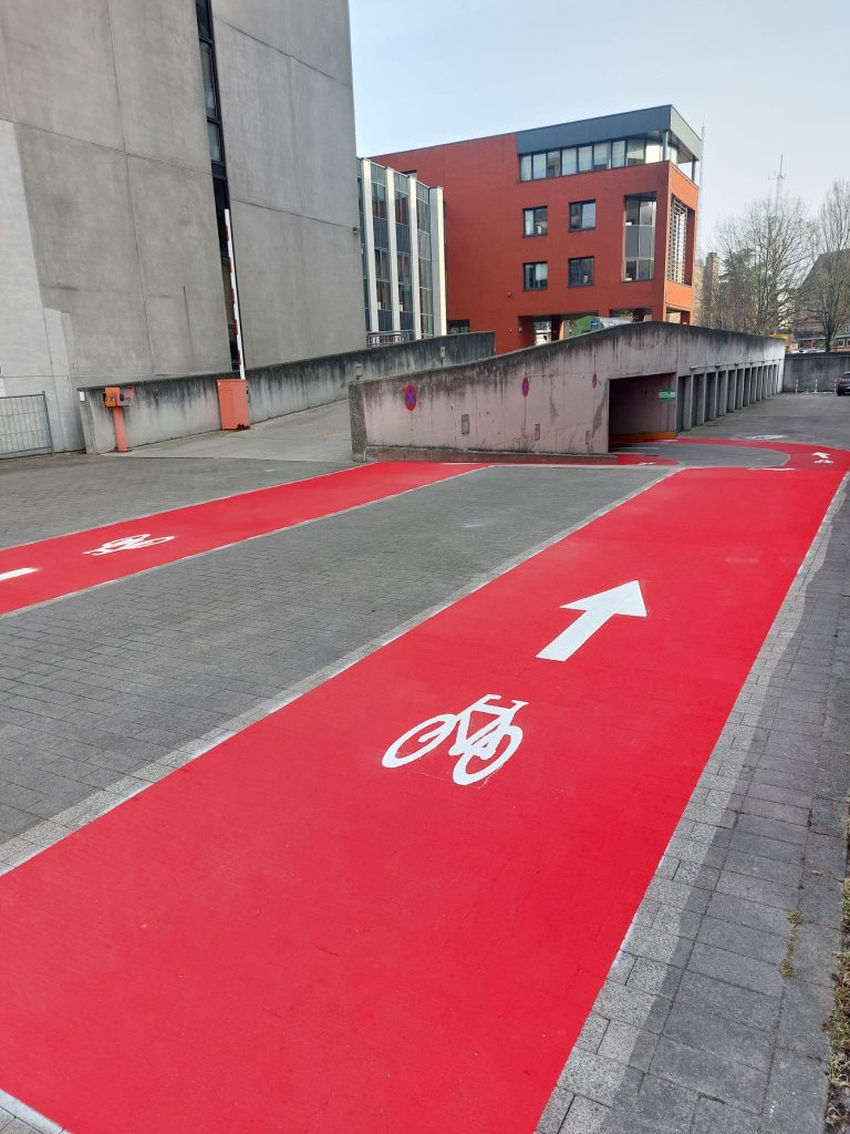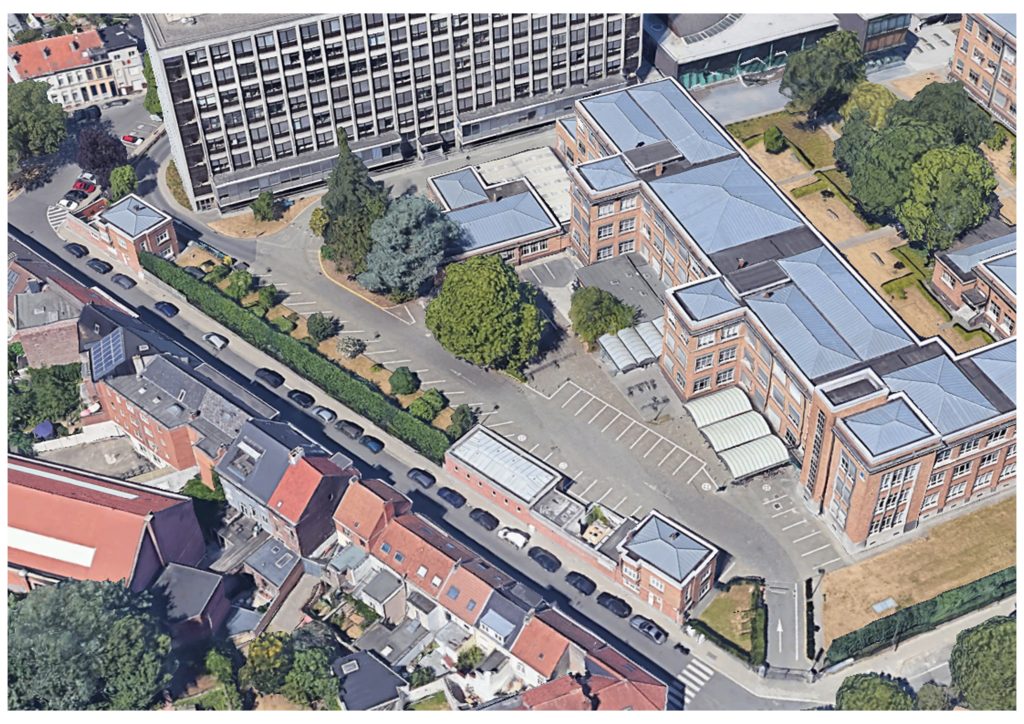 Ontharding en vergroening voorzijde campus Dunant. Een deel van de autoparking werd omgevormd tot fietsenstalling, waardoor de fietsrekken konden verdwijnen.